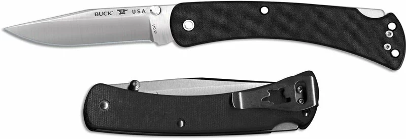 The 0110BKS4 Buck 110 Slim Pro – a lightweight, slim EDC version of the traditional Buck 110 folder, features a 3 3/4 inch clip point blade made of S30V stainless steel, .120 inch thick, with dual thumb studs for ambidextrous one hand opening. The slim profile black G10 handle, 4 7/8 inches closed, has a lockback and a side to side reversible deep carry pocket clip mounted at the butt end. The Buck 110 Slim Pro has an overall open length of 8 5/8 inches, and it weighs only 3.0 ounces. Proudly made in the USA.
