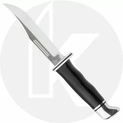 The illustrated Buck Knife is the Buck Brahma featuring a 4.5 inch clip point blade made of 420HC stainless steel and a contoured black Phenolic handle with an aluminum guard and pommel. A black leather belt sheath is included. The Buck Brahma has an overall length of 8.75 inches, and weighs 4.9 ounces. Made in the United States.