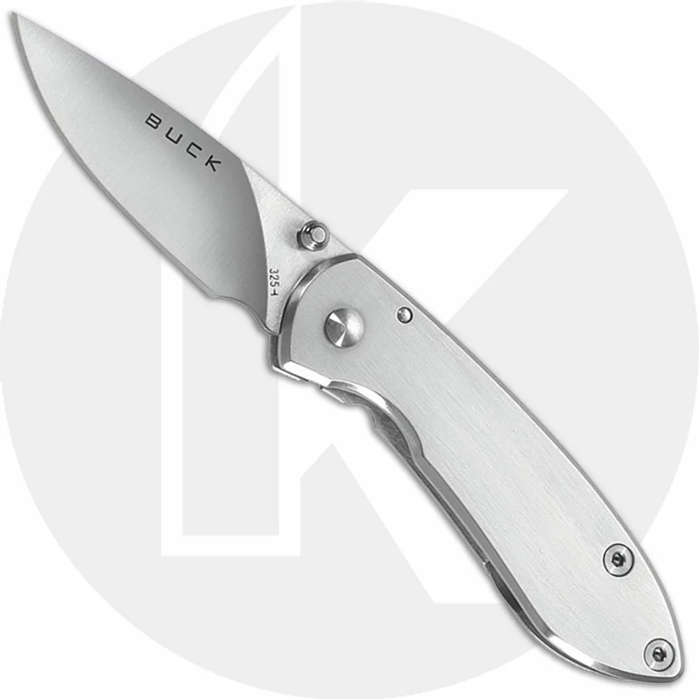 The illustrated Buck Knife is the Buck Colleague Knife that features a 1 7/8″ drop point blade made of 420HC stainless steel with a thumb stud for one hand opening. The brush finished stainless steel handle of this Buck knife, 2 3/4″ closed, has a frame lock. No pocket clip. The Buck Colleague Knife weighs 1.3 ounces.
