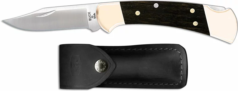 The illustrated Buck knife is the Buck Ranger Knife that features a 3″ clip point blade made of 420HC stainless steel, .120 inches thick, with a nail nick for opening. The Ebony handle of this Buck Knife, 4 1/4″ closed, has brass bolsters and a lockback. A black genuine leather belt sheath is included with this Buck knife. The Buck Ranger Knife has an overall length of 7 1/4″ when open, and it weighs 5.6 ounces. Made in the USA.