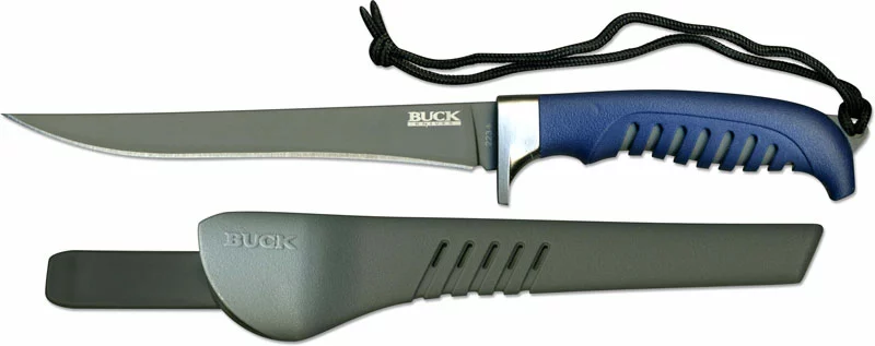 The illustrated Buck Knife is the Medium Buck Silver Creek Fillet Knife that features a 6 3/8″ blade made of 420J2 stainless steel. The blade of this Buck knife has a corrosion resistant gray titanium coat and is designed for added flexibility. The glass reinforced polypropylene handle has a slotted blue TPE rubber overmold for secure grip, a stainless steel guard and a lanyard hole. An injection molded black plastic sheath with integral belt clip and stylized drain hole is included with this Buck knife. The Medium Buck Silver Creek Fillet Knife has an overall length of 11 1/8″, and weighs 5 ounces.