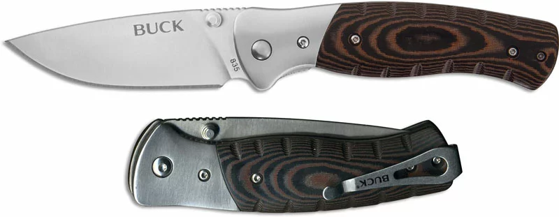 The illustrated Buck knife is the Buck Small Folding Selkirk Knife that features a 3 1/4″ drop point blade made of 420HC stainless steel, .120 inches thick, with dual thumb studs for ambidextrous one hand opening. The brown and black Micarta handle, 4 1/4″ closed, has a steel bolster, CNC contouring for secure grip, steel liners for strength, and a liner lock. A removable steel pocket clip is mounted at the butt end of this Buck Knife. The Buck Small Folding Selkirk Knife has an overall open length of 7 1/2″, and it weighs 4.5 ounces. Made in China.
