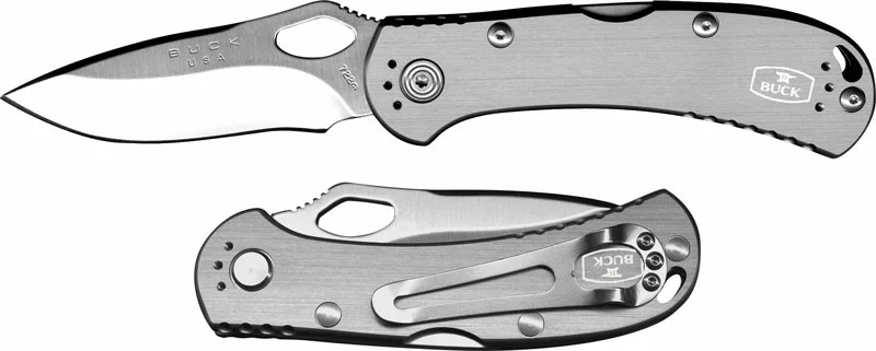 The illustrated Buck Knife is the Buck SpitFire Knife that features a 3 1/4″ drop point blade made of 420HC stainless steel, .120″ thick. This blade of this Buck knife has a top swedge, a notched thumb rest for secure grip and a hole for amdidextrous one hand opening. The slim Gray anodized aluminum handle, 4 1/4″ closed, has a contrasting colored back spacer, a lockback and a lanyard hole. A side to side and end to end reversible steel pocket clip is included with this Buck Knife. The Buck SpitFire Knife with plain edge blade and Gray handle has an overall open length of 7 1/2″, and it weighs 3.2 ounces. Made in the USA.