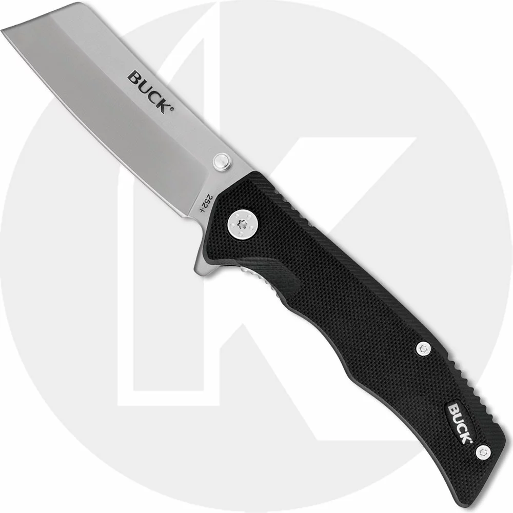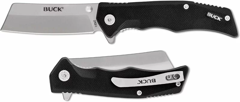 The 0252BKS Buck Trunk Knife is a value priced workhorse of an EDC that features a 2 7/8 inch cleaver style blade made of 7Cr stainless steel with a satin finish, dual thumb studs and a flipper for ambidextrous one hand opening. The textured black G10 handle, 4 inches closed, has ergonomic contours and notches for secure grip, steel liners for strength, sturdy liner lock and a removable deep carry pocket clip mounted at the butt end. The Buck Trunk Knife has an overall open length of 6 7/8 inches, and it weighs 3.1 ounces. Made in China.