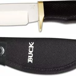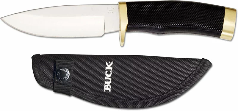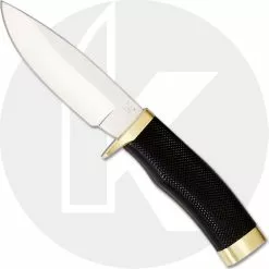 The illustrated Buck Knife is the Buck Vanguard R Knife that features a 4 1/8″ drop point blade made of 420HC stainless steel. The black textured rubberized handle of this Buck knife has a satin finished brass guard and butt. A heavy duty black nylon belt sheath is included with this Buck knife. The Buck Vanguard R Knife has an overall length of 8 1/2″, and weighs 6.6 ounces.