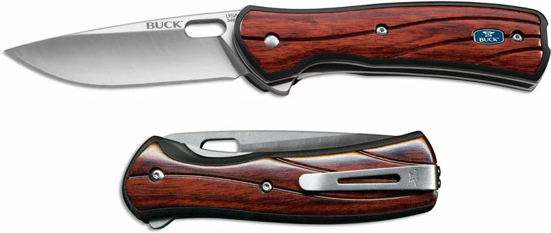 The illustrated Buck knife is the Large Select Buck Vantage Knife that features a 3 1/4″ drop point blade made of 420HC stainless steel, .120″ thick. The blade of this Buck knife has an oval hole and a Flipper for ambidextrous one hand opening. The black molded nylon handle, 4 3/8″ closed, has stainless steel liners for strength, CNC machined Rosewood Dymondwood onlays, Buck shield and a liner lock. A side to side reversible low carry stainless steel pocket clip is mounted at the butt end of this Buck knife. The Large Select Buck Vantage Knife with Rosewood Dymondwood handle has an overall open length of 7 5/8″, and it weighs 4 ounces. Made in the USA.