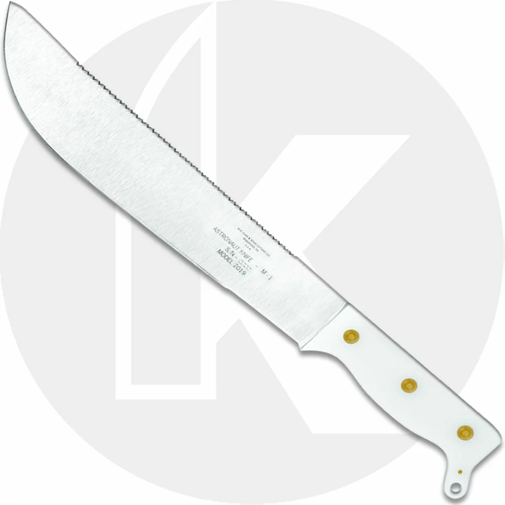 The 12019 Case Astronaut M-1 Commemorative features a 11.75 inch embellished sawback machete blade made of high carbon stainless steel, with an As Ground finish. The Astronaut M-1 Commemorative has full tang construction for strength, brass riveted Smooth White Synthetic handle with lanyard hole. Packaged in a two piece gift box. Overall length is 17.0 inches; weight is 7.5 ounces. Made in the USA.