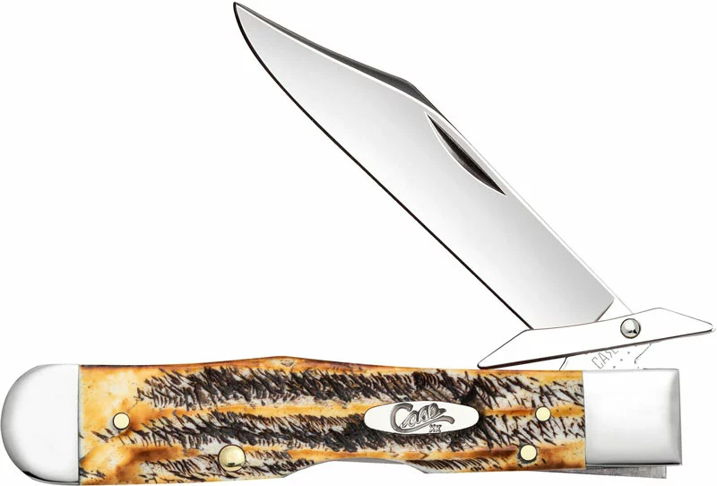 The 65319 Case 6.5 BoneStag (6.5111 1/2LSS) Cheetah Knife features a locking clip blade made of Tru-Sharp Surgical steel with a nail nick for opening and a swing guard. The hand flamed jigged bone handle of this Case knife, 4 3/8 inches closed, has the Case Oval Script shield, nickel silver bolsters and a lockback. The Case Cheetah Knife weighs 3.5 ounces. Made in the USA.