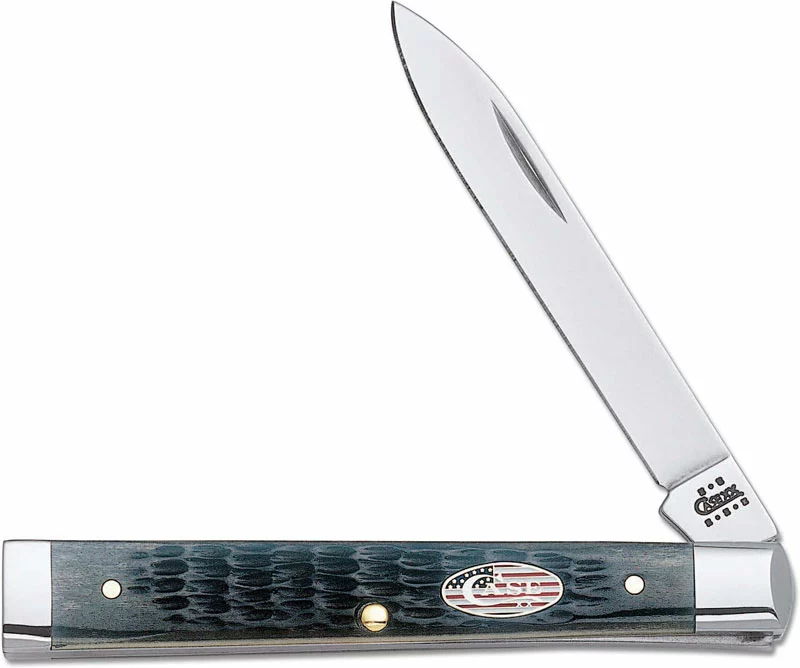 The 03512 Case Stars and Stripes (6185SS) Doctor’s Knife features a spear blade made of mirror polished Tru-Sharp Surgical steel with a nail nick for opening. The Rogers Jig Pitch Black Bone handle, 3 3/4 inches closed, has the red, white and blue Case Stars and Stripes Shield and nickel silver bolsters. The Case Doctor’s Knife weighs 1.7 ounces. Discontinued item, BNIB; made in the USA.