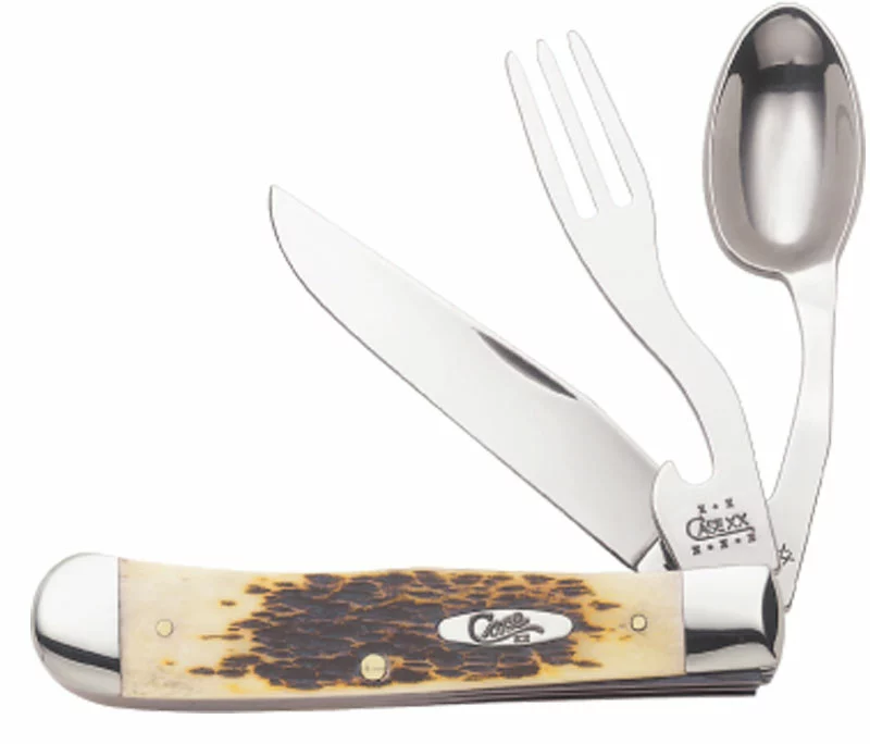 The illustrated Case Knife is the Amber Bone (6354HBSS) Case Hobo Knife that features a clip blade, a fork and a spoon made of Tru-Sharp surgical stainless steel. The Peachseed Jigged Amber Bone handle of this Case knife, 4 1/8″ closed, has a nickel silver Case shield and nickel silver bolsters. The Case Hobo Knife with Amber Bone handle weighs 7.7 ounces. Made in the USA.