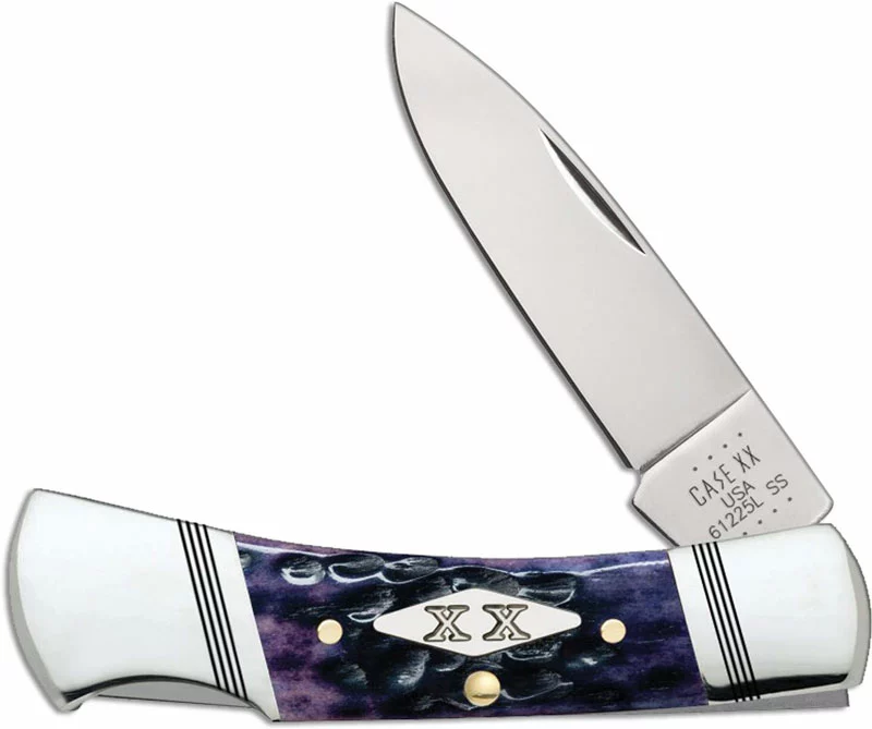 The 31621 Case Purple Bone (61225LSS) Lockback Knife features a locking drop point blade made of mirror polished Tru-Sharp Surgical Steel with a nail nick for opening. The Standard Jig Purple Bone handle, 3 inches closed, has the Case Diamond XX shield, embellished nickel silver bolsters and a lockback. The Case Lockback Knife weighs 1.9 ounces. Made in the USA.