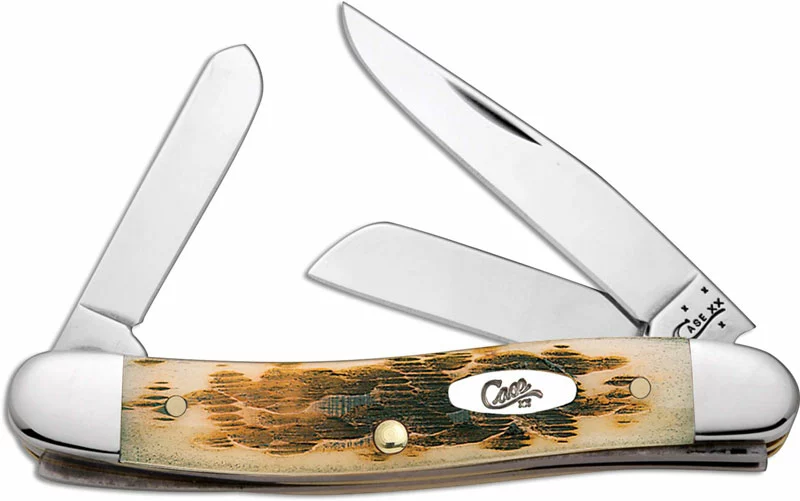 The illustrated Case Knife is the Amber Bone (6318SS) Case Medium Stockman Knife that features clip, sheepfoot and spey blades made of Tru-Sharp surgical stainless steel with nail nicks for opening. The Peachseed Jigged Amber Bone handle of this Case knife, 3 5/8″ closed, has a nickel silver Case shield and nickel silver bolsters. The Case Medium Stockman Knife with Amber Bone handle weighs 2.5 ounces. Made in the USA.
