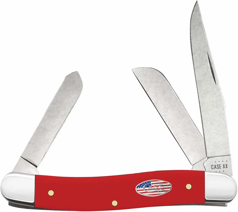 The 73931 Case American Workman CS (4318CS) Medium Stockman Knife features clip, spey and sheepfoot blades made of carbon steel with nail nicks for opening. The Smooth Red Synthetic handle, 3 5/8 inches closed, has the Case Stars and Stripes Shield and nickel silver bolsters. The Case Medium Stockman Knife weighs 2.5 ounces. Made in the USA.