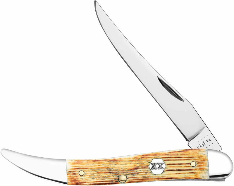 The 36724 Case Burnt Cream Bone (610094SS) Medium Texas Toothpick Knife features a long clip blade made of Tru-Sharp Surgical steel with a nail nick for opening. The Barnboard Jigged Burnt Cream Bone handle, 4 1/4 inches closed, has the XX Hexagonal Shield and nickel silver bolsters. The Case Medium Texas Toothpick Knife weighs 2.1 ounces. Made in the USA.
