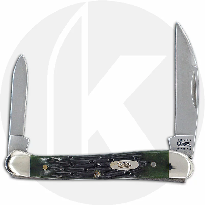 The 03503 Case Hunter Green (62109WSS) Mini Copperhead Knife features Wharncliffe and pen blades made of mirror polished Tru-Sharp Surgical steel with nail nicks for opening. The jigged Hunter Green Bone handle, 3 1/8 inches closed, has the Case Oval Script Shield and nickel silver bolsters. The Case Mini Copperhead Knife weighs 1.4 ounces. Discontinued item, BNIB; made in the USA in 2000.