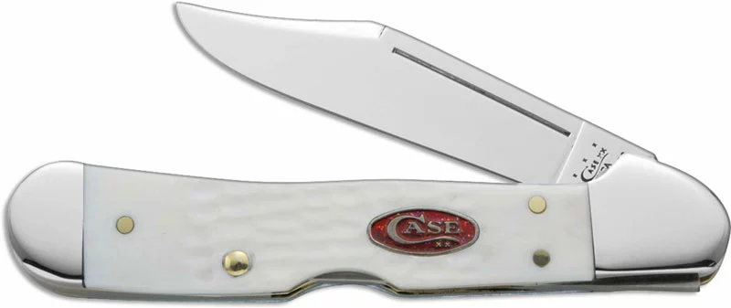 The illustrated Case Knife is the SparXX (61749LSS) Case Mini CopperLock Knife that features a locking clip blade made of Tru-Sharp surgical stainless steel with a nail nick for opening. The Jigged White Synthetic handle of this Case knife, 3 5/8″ closed, comes with a red enameled Case Glitter shield, nickel silver bolsters and a lockback. The Case SparXX Mini CopperLock Knife with Jigged White Synthetic handle weighs 2 ounces. Made in the USA.
