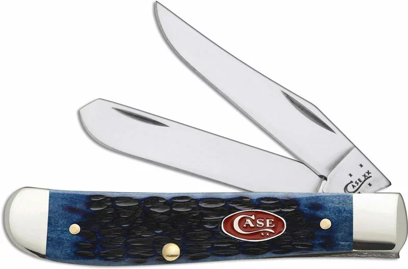 The illustrated Case Knife is the Navy Blue Bone (6207SS) Case Mini Trapper Knife that features clip and spey blades made of Tru-Sharp surgical steel with nail nicks for opening. The Rogers Jigged Blue Bone handle of this Case knife, 3 1/2″ closed, has an inlaid Red Case Oval shield and nickel silver bolsters. The Case Mini Trapper Knife with Navy Blue Bone handle weighs 2.7 ounces. Proudly made in the USA.