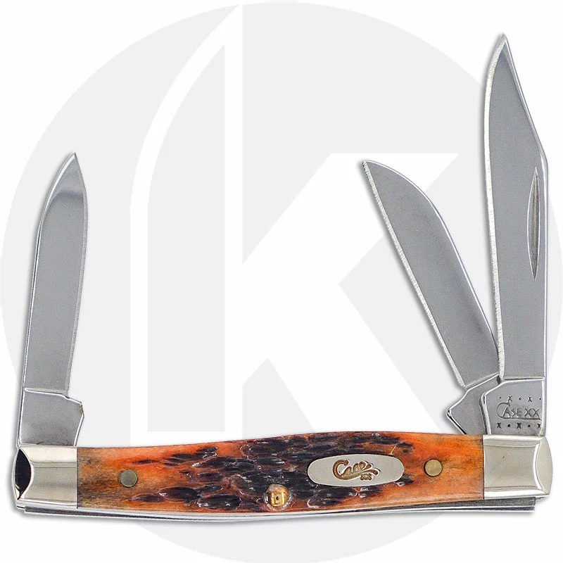 The 01155 Case Autumn Bone (6333 SSM) Small Stockman Knife features clip, sheepfoot and pen blades made of Tru-Sharp Surgical steel with mirror polished finish and nail nicks for opening. The Peach Seed Jig Autumn Bone handle, 2 5/8 inches closed, has the Case Oval Script Shield and nickel silver bolsters. The Case Small Stockman Knife weighs .9 ounce. Discontinued item, BNIB; made in the USA in 2000.