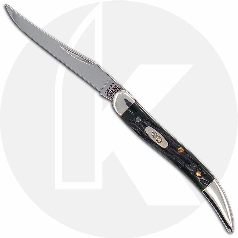 The 03500 Case Hunter Green (610096SS) Small Texas Toothpick Knife features a long clip blade made of mirror polished Tru-Sharp Surgical steel with a nail nick for opening. The jigged Hunter Green Bone handle, 3 inches closed, has the Case Oval Script Shield and nickel silver bolsters. The Case Small Texas Toothpick Knife weighs 1.0 ounce. Discontinued item, BNIB; made in the USA in 2000.