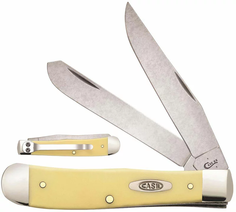 The Case Smooth Yellow Synthetic (3254CCV) Trapper Knife with Clip features clip and spey blades made of chrome vanadium carbon steel with nail nicks for opening. The Smooth Yellow Synthetic handle, 4 1/8″ closed, has the Case Oval shield, nickel silver bolsters and a pocket clip. The Case Trapper with Clip Knife weighs 4 ounces. Made in the USA.
