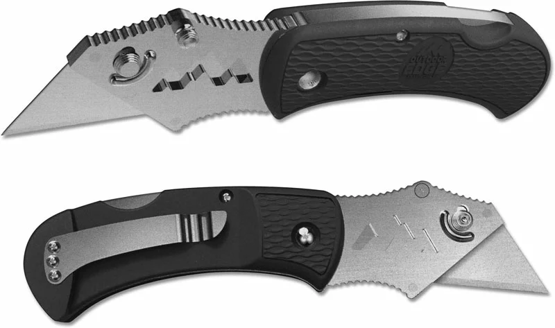 From the Outdoor Edge Product Guide: This folding utility knife is a massive upgrade to the classic box cutter – and much, much more. The perfect ergonomics along with extensive jimping on the steel blade holder delivers power from your arm and wrist directly into the cutting edge of the blade. Simply and safely replace blades with a flick of your finger using the safety-guarded thumb button. Accepts a standard utility razor blade.