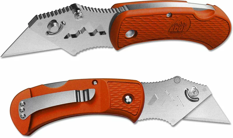 From the Outdoor Edge Product Guide: This folding utility knife is a massive upgrade to the classic box cutter – and much, much more. The perfect ergonomics along with extensive jimping on the steel blade holder delivers power from your arm and wrist directly into the cutting edge of the blade. Simply and safely replace blades with a flick of your finger using the safety-guarded thumb button. Accepts a standard utility razor blade.