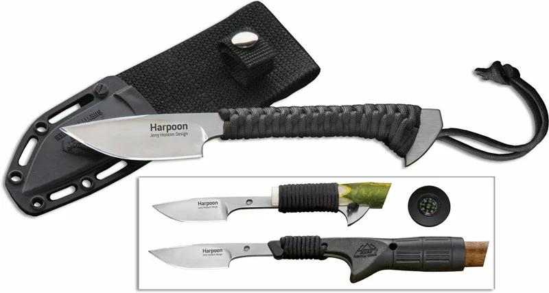 Changes easily from knife to harpoon by slotting a green shaft with the sharp hawksbill end of the handle and tying the knife in, or by threading the accessory blade holder onto a standard broom handle. The hollow handle blade holder features a liquid filled compass in the cap with a compartment for storing fish hooks, line, matches, and other survival essentials. The Harpoon comes complete with a quality nylon belt sheath. Designed by custom knife maker Jerry Hossom. Patents Pending.