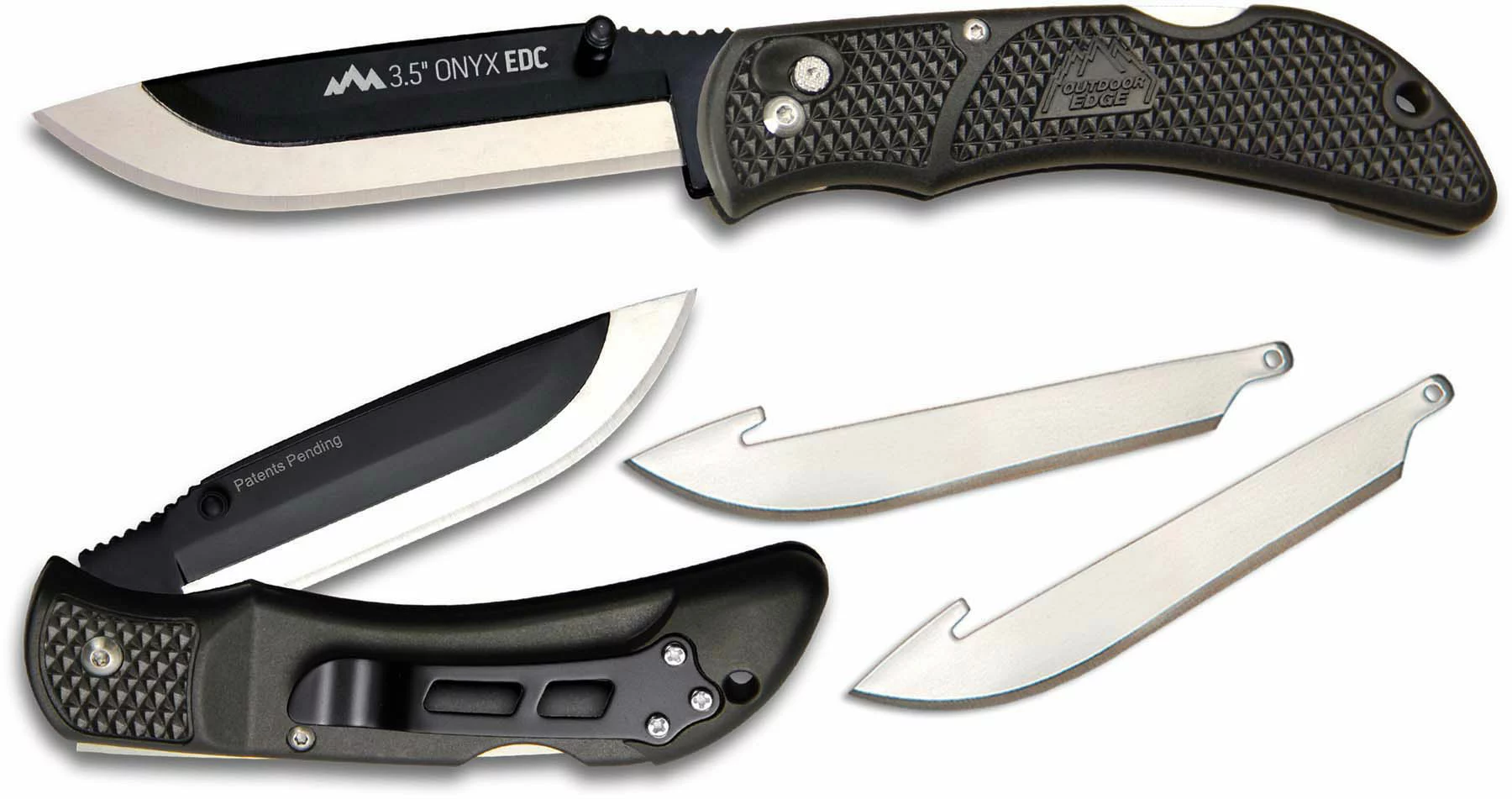 The illustrated Outdoor Edge Knife is the Outdoor Edge Onyx EDC Knife that features a 3.5″ replaceable drop point blade made of Japanese 420J stainless steel, with a Rockwell hardness of 57. The blade area of this Outdoor Edge knife has a notched thumb rest for secure grip, and dual thumb studs for ambidextrous one hand opening. The black Grivory (glass reinforced nylon) handle, 4.5″ closed, has Trimond™ texuring for secure purchase, a lockback, a lock button for fast blade changes, and a lanyard hole. A removable black steel pocket clip is mounted at the butt end of this Outdoor Edge Knife, and three blades are included. The Outdoor Edge Onyx EDC Knife has an overall open length of 8″, and it weighs 2.6 ounces.