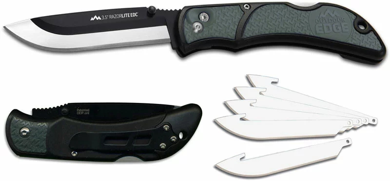 From the Outdoor Edge website: The sharpest, strongest replacement blade knives available for everyday carry with removable/replaceable pocket clip, one-hand opening and six replacement blades. To replace the blade simply push the lock button in the handle to remove and insert a shaving-sharp new blade. The black-oxide coated blade holder supports the razor-blade for the strength of a traditional knife and sharpness of a surgeon’s scalpel. …