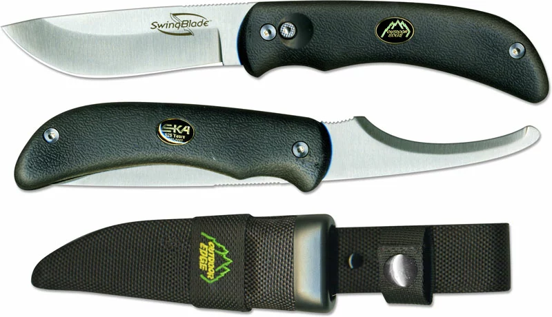 The illustrated Outdoor Edge Knife is the Outdoor Edge SwingBlade Knife, a collaborative effort of Outdoor Edge President David Block, EKA Knives of Sweden and professional Swedish hunter Thomas Ekburg. The innovative SwingBlade knife features a rotating 3.6″ drop point skinning blade and a 3.2″ safety tip gutting blade made of AUS8 stainless steel, with a Rockwell hardness of 57-58. Both halves of the rotating blade have a notched thumb rest for secure grip. The handle of this Outdoor Edge knife is made of rubberized Kraton for secure non slip grip, and comes with a lock button. A quality nylon belt sheath with molded liner is included with this Outdoor Edge knife. The Outdoor Edge SwingBlade Knife has an overall length of 8.3″.