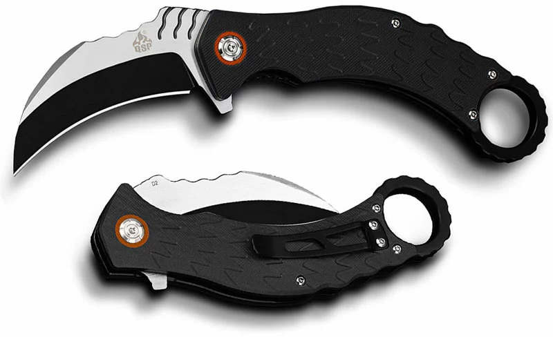 QSP Knives: QSP Eagle Karambit, 2 Tone Satin Black Blade, Black G10 Handle, QSP-120A