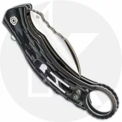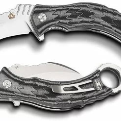 The QS120-E QSP Eagle Karambit Knife is a value price self defence EDC that features a 3.125 inch hawkbill blade made of Chinese D2 tool steel with a satin finish, a notched thumb rest for secure grip, and a flipper for ambidextrous one hand opening. The black and gray G10 handle, 5.375 inches closed, has eagle feather texturing for secure purchase, ceramic ball bearing pivot for smooth opening, stainless steel liners for strength, a sturdy liner lock, steel backspacer that transitions into a traditional ring pommel, and a removable steel pocket clip mounted at the butt end. The QSP Eagle Knife has an overall open length of 8.00 inches, and it weighs 5.2 ounces. Made in China.