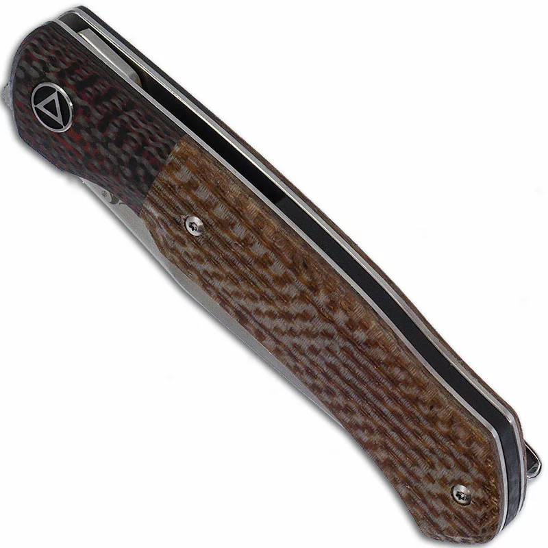 The QS137-B QSP Gannet Knife is an eyecatching EDC that features a 3.375 inch clip point blade made of 154CM stainless steel with a satin finish and a notched flipper tang for ambidextrous one hand opening. The brown linen micarta handle, 4.50 inches closed, has a red carbon fiber bolster for visual interest, ceramic ball bearing pivot for smooth opening, stainless steel liners for strength, a sturdy liner lock and a removable deep carry steel pocket clip mounted at the butt end. This QSP Gannet Knife has an overall open length of 7.875 inches, and it weighs 3.50 ounces. Made in China.