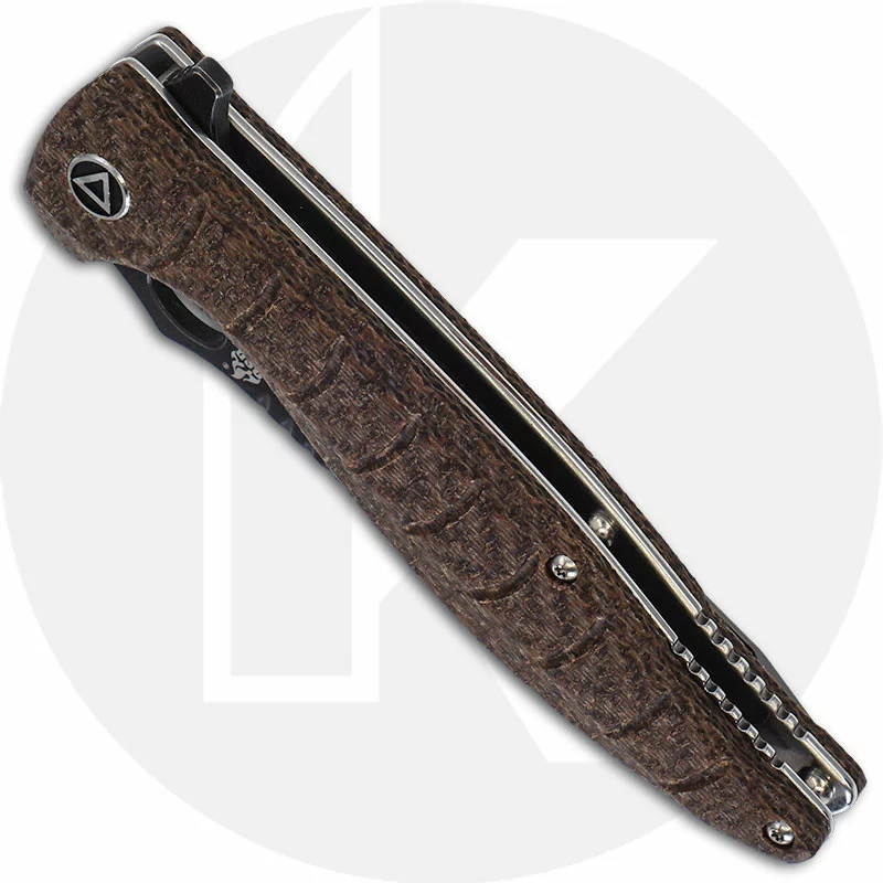 The QS117-A QSP Locust is an eye catching value price EDC that features a 3.875 inch Wharncliffe blade made of 154CM stainless steel with a two tone black and satin finish, a notched thumb ramp for secure grip, and a flipper for ambidextrous one hand opening. The ergonomic brown flax micarta handle, 4.875 inches closed, has a pivot with ceramic ball bearing support for smooth opening, stainless steel liners for strength, sturdy liner lock, and a titanium pocket clip mounted at the butt end. The QSP Locust Knife has an overall open length of 8.75 inches, and it weighs 4.1 ounces. Made in China.