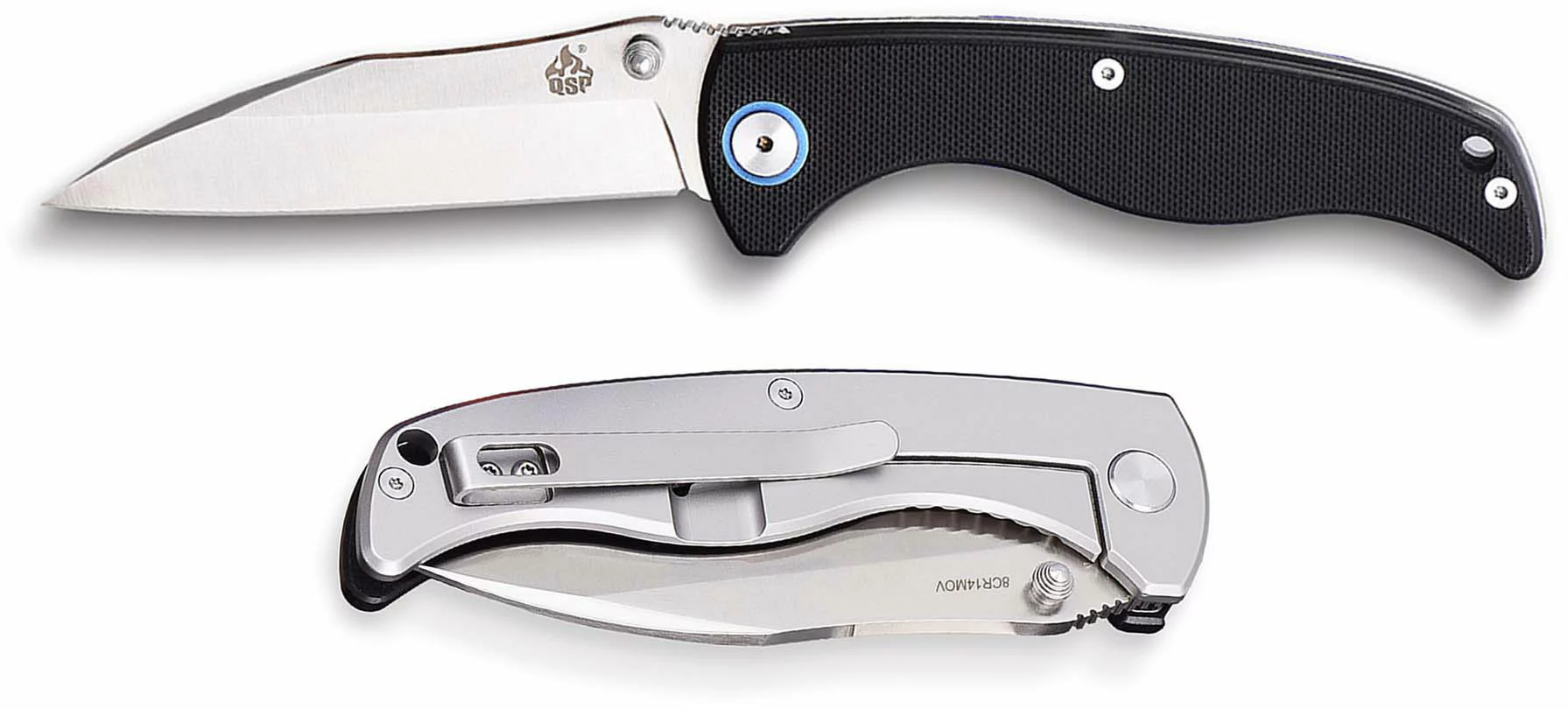 The QS110-A QSP Nokomis is a value price EDC, designed by Clay Mewes, that features a 3.75 inch Wharncliffe blade made of 8Cr14MoV stainless steel with a two tone stonewash and satin finish, a swedged tip, a notched thumb ramp for secure grip, and dual thumb studs for ambidextrous one hand opening. The ergonomic handle, 4.50 inches closed, has a black G10 front, stainless steel back with frame lock, a lanyard hole, and a stainless steel pocket clip mounted at the butt end. The QSP Nokomis Knife has an overall open length of 8.25 inches, and it weighs 4.6 ounces. Made in China.