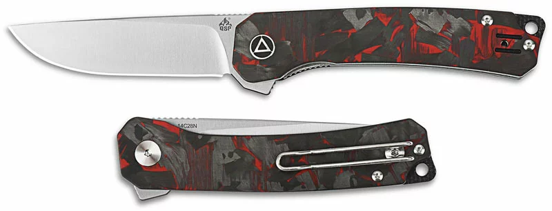 The QS139-F1 QSP Osprey is a sleek value price EDC that features a 3.25 inch classic drop point blade made of 14C28N stainless steel, 3mm thick, with a Rockwell hardness of 59-61, satin finish, notched thumb rest for secure grip, and a flipper for ambidextrous one hand opening. The eyecatching ergonomic shredded black and red carbon fiber overlay G10 handle, 4.25 inches closed, has a pivot with ceramic ball bearing support for smooth opening, sturdy liner lock, stainless steel liners and back spacer (with integral lanyard hole) for strength, and a side to side reversible wire clip mounted at the butt end. This QSP Osprey Knife has an overall open length of 7.5 inches, and it weighs 3.5 ounces. Made in China.
