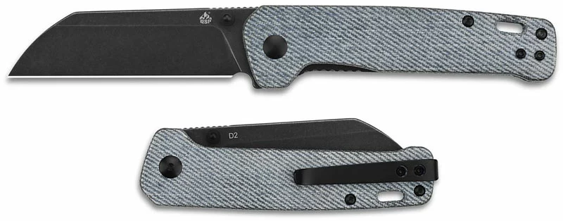 The QS130-B2 QSP Penguin is a compact value price everyday carry knife that features a 3.06 inch sheepfoot blade made of Chinese D2 tool steel, 3.5mm thick, with a Rockwell hardness of 57-59, non reflective black stonewash finish, a notched thumb rest for secure grip, and dual thumb studs for ambidextrous one hand opening. The denim micarta handle, 4.00 inches closed, has stainless steel liners for strength, sturdy liner lock, a lanyard hole and a side to side reversible deep carry stainless steel pocket clip mounted at the butt end. The QSP Penguin Knife has an overall open length of 7.06 inches, and it weighs 3.14 ounces. Made in China.