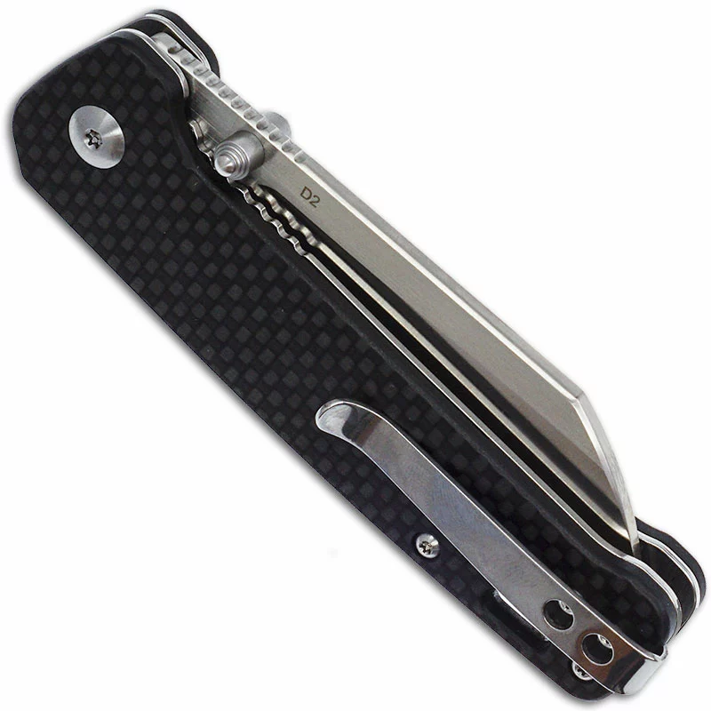 The QS130-E QSP Penguin is a compact value price everyday carry knife that features a 3.06 inch sheepfoot blade made of Chinese D2 tool steel with a two tone satin finish, a notched thumb rest for secure grip, and dual thumb studs for ambidextrous one hand opening. The G10 handle, 4.00 inches closed, has an eyecatching carbon fiber overlay, stainless steel liners for strength, sturdy liner lock, a lanyard hole and a side to side reversible deep carry stainless steel pocket clip mounted at the butt end. This QSP Penguin Knife has an overall open length of 7.06 inches, and it weighs 3.42 ounces. Made in China.