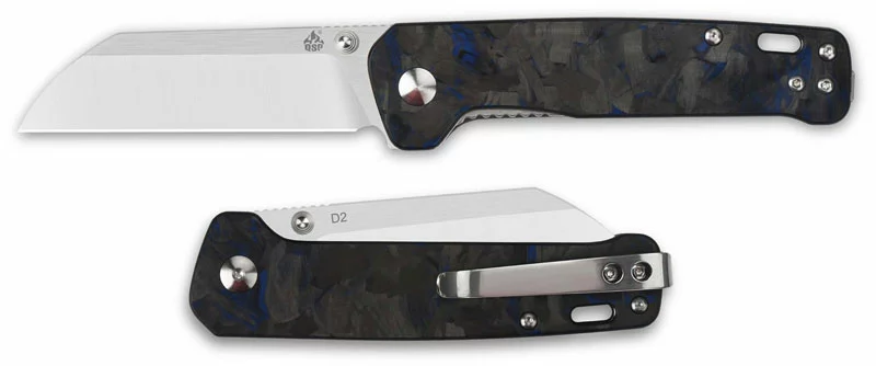 The QS130-TBL QSP Penguin is a compact value price everyday carry knife that features a 3.06 inch sheepfoot blade made of Chinese D2 tool steel, 3mm thick, with a Rockwell hardness of 58-60, two tone satin finish, a notched thumb rest for secure grip, and dual thumb studs for ambidextrous one hand opening. The eye catching shredded black and blue carbon fiber overlay G10 handle, 4.00 inches closed, has stainless steel liners for strength, sturdy liner lock, a lanyard hole and a side to side reversible deep carry stainless steel pocket clip mounted at the butt end. This QSP Penguin Knife has an overall open length of 7.06 inches, and it weighs 3.39 ounces. Made in China.