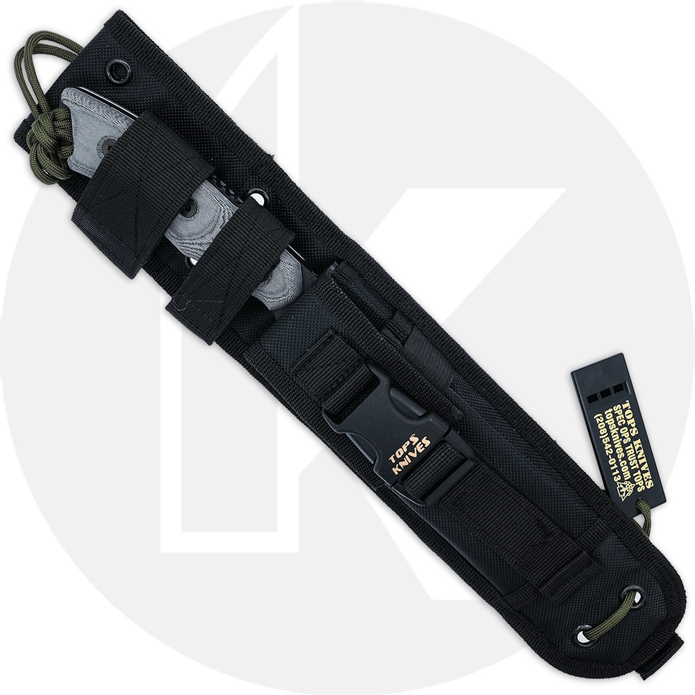 The AH906 TOPS Alaskan Harpoon Knife is a versatile outdoor essential that features a 6.75 inch harpoon style fixed blade made of 1095 steel, .250 inch thick, with a Rockwell hardness of 56-58. The blade has a 5.87 inch cutting edge, a swedged spine, non reflective Black Traction Coat, and long notched thumb rest for secure grip. The Alaskan Harpoon Knife has full tang construction for strength; ergonomic black linen Micarta scales, a pronounced choil and a notched area on the spine for secure purchase, and a lanyard hole. A black ballistic nylon sheath with MOLLE back is included. The TOPS Knives Alaskan Harpoon has an overall length of 12 inches, and it weighs 15.2 ounces; 20 ounces with the sheath. Made in the USA.