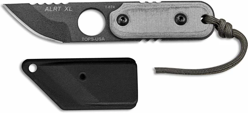The TOPS ALRTXL 05 Neck Knife is a compact little powerhouse that features a 2.75 inch Hunters Point fixed blade made of 1095 steel, .190 inch thick, with a Rockwell hardness of 56-58, a non reflective Black Traction Coat, and a large finger hole and notched thumb rest for secure grip and precise control. The ALRTXL 05 (Anywhere Last Resort Tool) has full tang construction for strength; contoured black linen Micarta scales and a lanyard hole. An injection molded neck sheath is included. The TOPS Knives ALRTXL 05 Neck Knife has an overall length of 5.37 inches, and it weighs 3.5 ounces; 4.3 ounces with the sheath. Made in the USA.