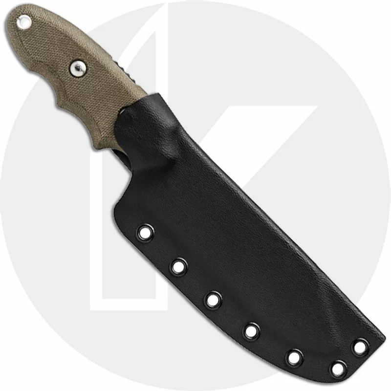 The BPB-01 TOPS Backpacker’s Bowie Knife is a compact versatile camp knife that features a 4.5 inch clip point blade made of tough 1095 tool steel, .160 inch thick, with a 4.13 inch cutting edge and a Rockwell hardness of 56-58. The blade has a tumbled finish, handy wirebreaker notch / pot lifter, notched thumb rest and integral finger guard (with wrist lanyard hole) for secure purchase and precise control. The Backpacker’s Bowie has full tang construction for strength; finger grooved green canvas Micarta scales for secure, comfortable grip, and a lanyard hole. A black Kydex sheath with rotating spring clip is included. The TOPS Knives Backpacker’s Bowie Knife has an overall length of 8.25 inches, and it weighs 7.2 ounces; 9.7 ounces with the sheath. Made in the USA.