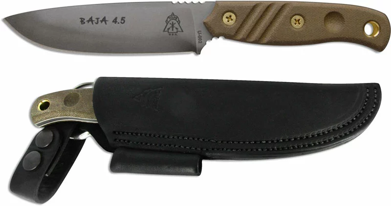 The TOPS Baja 4.5 Knife is an excellent field / camp knife that features a 4.88 inch drop point fixed blade made of 1095 steel, .160 inch thick, with a Rockwell hardness of 56-58. The blade has a 4.50 inch cutting edge, a full flat grind, unique Black River Wash finish, and notched thumb rest and finger guard for secure grip. The Baja 4.5 Knife has full tang construction for strength; ergonomic green canvas Micarta scales with integral bow drill divot and a lined lanyard hole. A genuine leather dangler sheath is included. The TOPS Knives Baja 4.5 Knife has an overall length of 9.25 inches, and it weighs 6.2 ounces; 12 ounces with the sheath. Made in the USA.