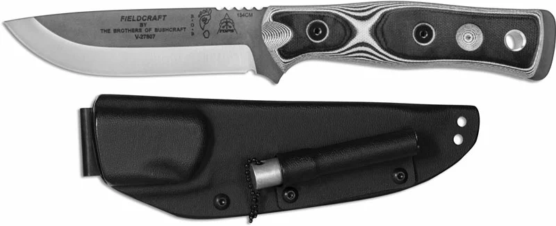 The BROS-154-WB TOPS Fieldcraft Knife, designed by The Brothers of Bushcraft (aka BOB), is an outdoorsman’s essential that features a 4.75 inch drop point fixed blade made of 154CM stainless steel, .190 inch thick, with a Rockwell hardness of 58-60. The blade has a 4.50 inch cutting edge, a modified Scandi Grind, Tumble Finish and a notched thumb rest for secure grip. The Fieldcraft Knife has full tang construction for strength; ergonomic white and black G10 scales with integral bow drill divot, a lined lanyard hole, and an extended pommel. A black Kydex sheath with rotating spring steel clip (for multiple carry options), and Ferro rod attachment point is included. The TOPS Knives / Brothers of Bushcraft Fieldcraft 154CM Knife has an overall length of 10.0 inches, and it weighs 10.5 ounces; 14 ounces with the sheath. Made in the USA.