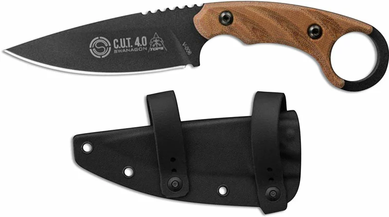TOPS Knives: TOPS C.U.T. 4.0, Black Blade with Tan Micarta and Ring Pommel, TK-CUT40