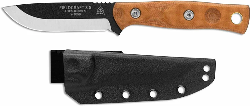 Clearly with all of that success, many people have requested many changes and different options. One of them that a lot of people seem to agree would be great is a smaller version. This is why TOPS created the Fieldcraft 3.5. It’s a smaller, slightly slimmer version of the original. It’s got TOPS’ modified Scandi grind, black traction coating, tan canvas Micarta handles, and a great Kydex sheath. The 3 5/8″ blade length is an excellent size for most cutting tasks. So this knife will excel as a bushcrafter, hunting knife, camp knife, and even as a fixed-blade EDC.
