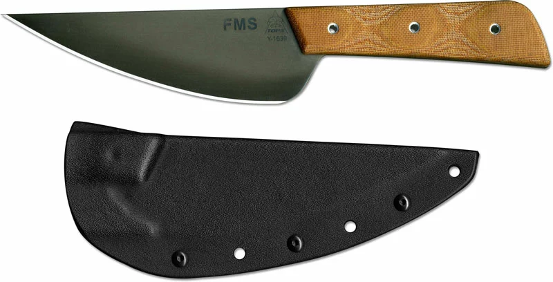 The FMS-05 TOPS Frog Market Special is a great utility kitchen / camp knife, designed by Tactical Knives editor Steven Dick (inspired by the style of knife used by butchers and fish mongers in Vietnam), that features a 5.25 inch super thin fixed blade made of 1095 steel, .060 inch thick, with a Rockwell hardness of 56-58. The blade has a wide heel for chopping, slight flex and sharp tip for boning, and an attractive Black River Wash finish. The Frog Market Special has full tang construction for strength with ergonomic tan canvas micarta scales for secure, comfortable grip. A black Kydex sheath with rotating spring steel clip is included. The TOPS Knives Frog Market Special Knife has an overall length of 9.50 inches, and it weighs 3.5 ounces. Made in the USA.