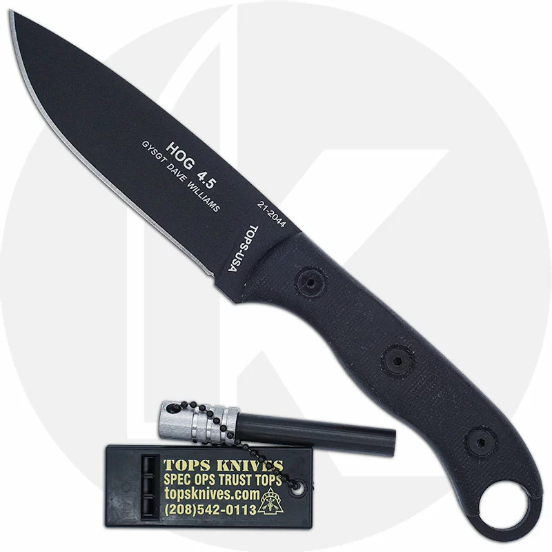 The HOG-45 TOPS Hunters of Gunmen is an outstanding field knife, designed by David Norseman Williams USMA (Ret), that features a 4.38 inch drop point fixed blade made of 1095 steel, .190 inch thick, with a Rockwell hardness of 56-58, and a non reflective Black Traction Coat. The Hunters of Gunmen has full tang construction for strength; ergonomic black linen micarta scales for comfort, and a large multi-use carabiner hole. A genuine leather dangler sheath is included. The TOPS Knives Hunters of Gunmen Knife has an overall length of 9.75 inches, and it weighs 8.3 ounces; 12.5 ounces with the sheath. Made in the USA.