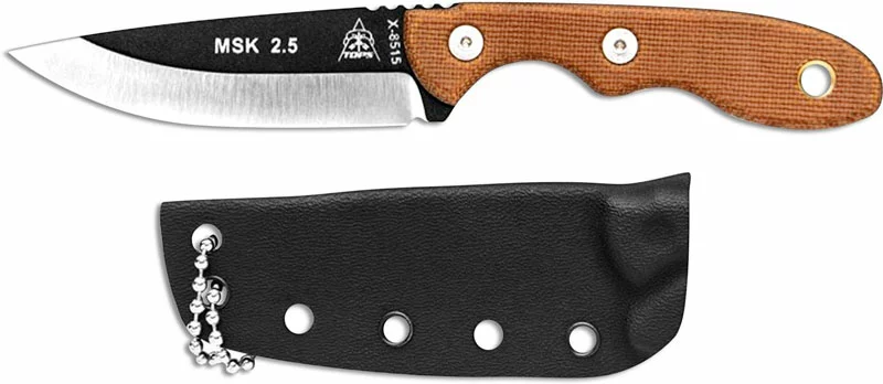 The MSK-2.5 TOPS Mini Scandi Knife, designed by Leo Espinoza, is a compact bushcraft style neck knife that features a 3.0 inch drop point fixed blade made of 1095 steel, .130 inch thick, with a Rockwell hardness of 56-58, a modified Scandi Grind, Black Traction Coat on the flats and a notched thumb rest for secure grip. The Mini Scandi has full tang construction for strength; finger grooved tan canvas micarta scales for secure purchase, and a lined lanyard hole. A black Kydex neck sheath with ball chain is included. This TOPS Knives Mini Scandi Knife has an overall length of 6.13 inches, and it weighs 2.3 ounces; 3.8 ounces with the sheath. Made in the USA.