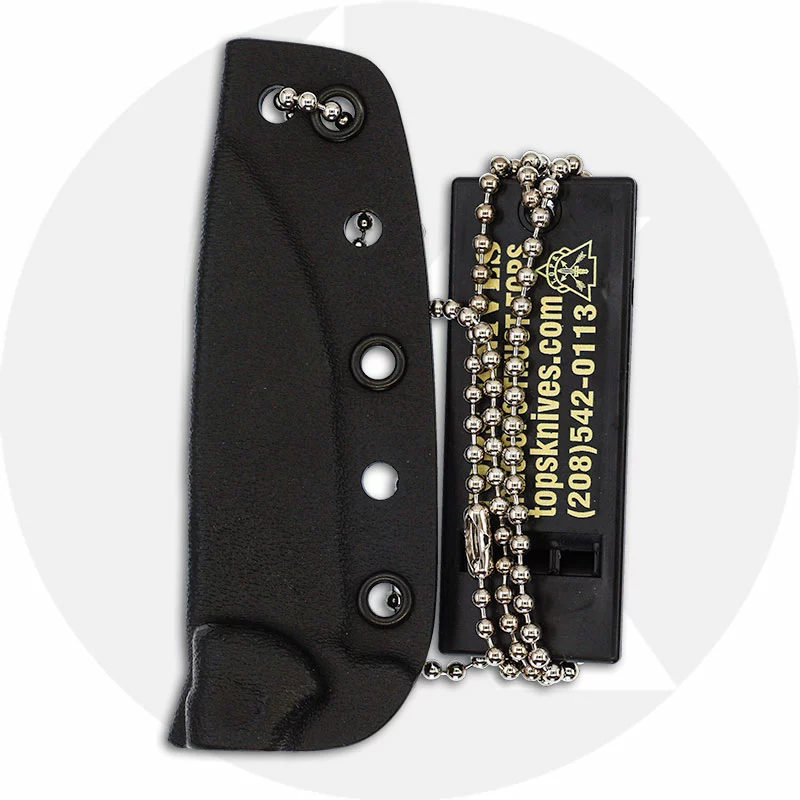 The MSK-GB TOPS Mini Scandi Knife is a compact, easily concealable neck knife, designed by Leo Espinoza (based on the ever popular B.O.B. BROS-01), that features a 3.0 inch drop point fixed blade made of 1095 steel, .130 inch thick, with a Rockwell hardness of 56-58. The blade has a modified Scandi Grind with Black Traction Coat on the flats, and a notched thumb rest for secure grip and precise control. The Mini Scandi Knife has full tang construction for strength; ergonomic green/black G10 scales and a lanyard hole. A black Kydex neck sheath with ball chain is included. This TOPS Knives Mini Scandi has an overall length of 6.13 inches, and it weighs 3 ounces; 4.5 ounces with the sheath. Made in the USA.